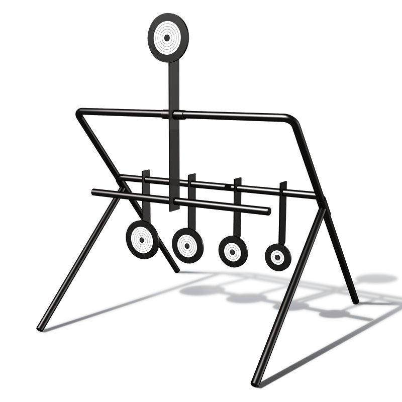 Мини-тир представляет собой, набор из пяти металлических медальонов, различного диаметра с механизмом, который обеспечивает дистанционный сброс и восстановление исходного положения мишени. Отличается легкостью, простотой конструкции и долговечностью. При правильной последовательности попадания по мишеням не требует ручной установки мишеней в исходное положение. Корпус с мишенями выполнен из стали повышенной прочности.