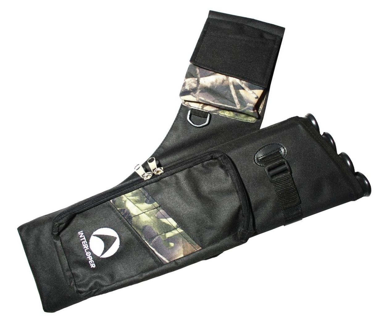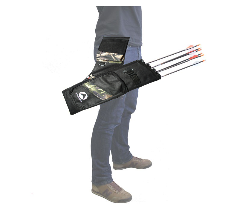 Колчан для ношения на поясе. Подходит для ношения на ремне. Имеет четыре пластиковых тубуса для стрел. Есть два кармана для лучных аксессуаров.