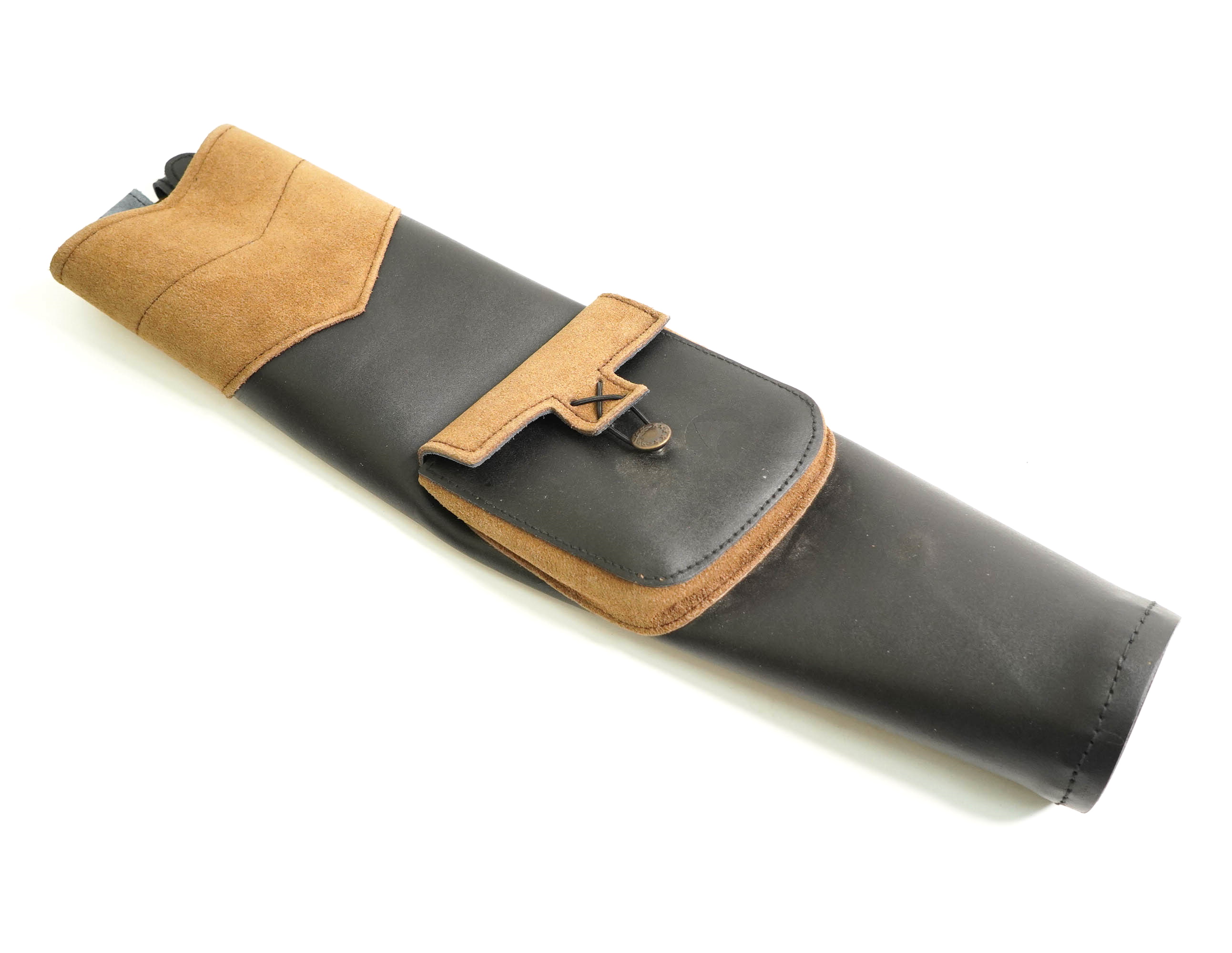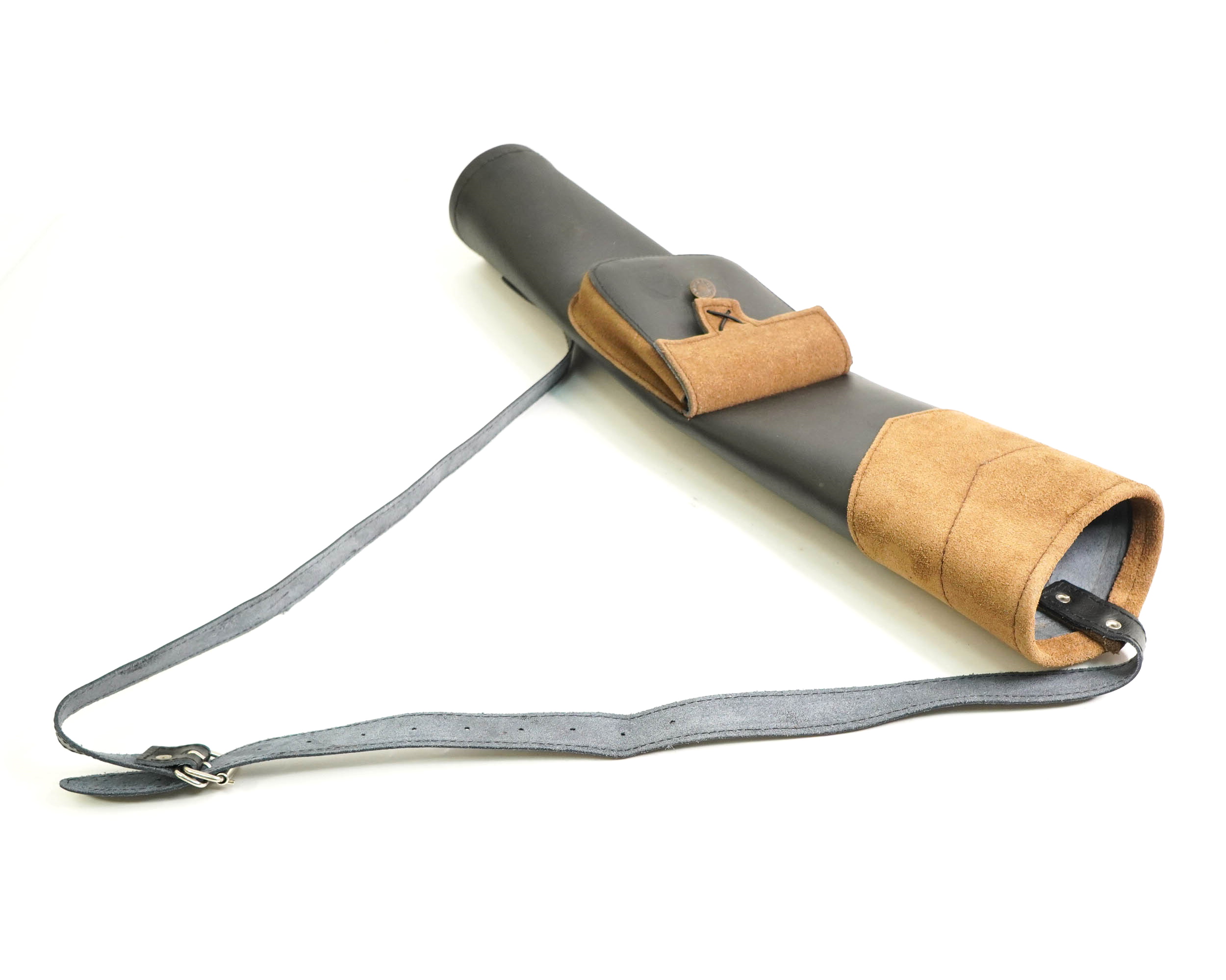 Заспинный колчан из кожи и замши с одним карманом и одной широкой лямкой.