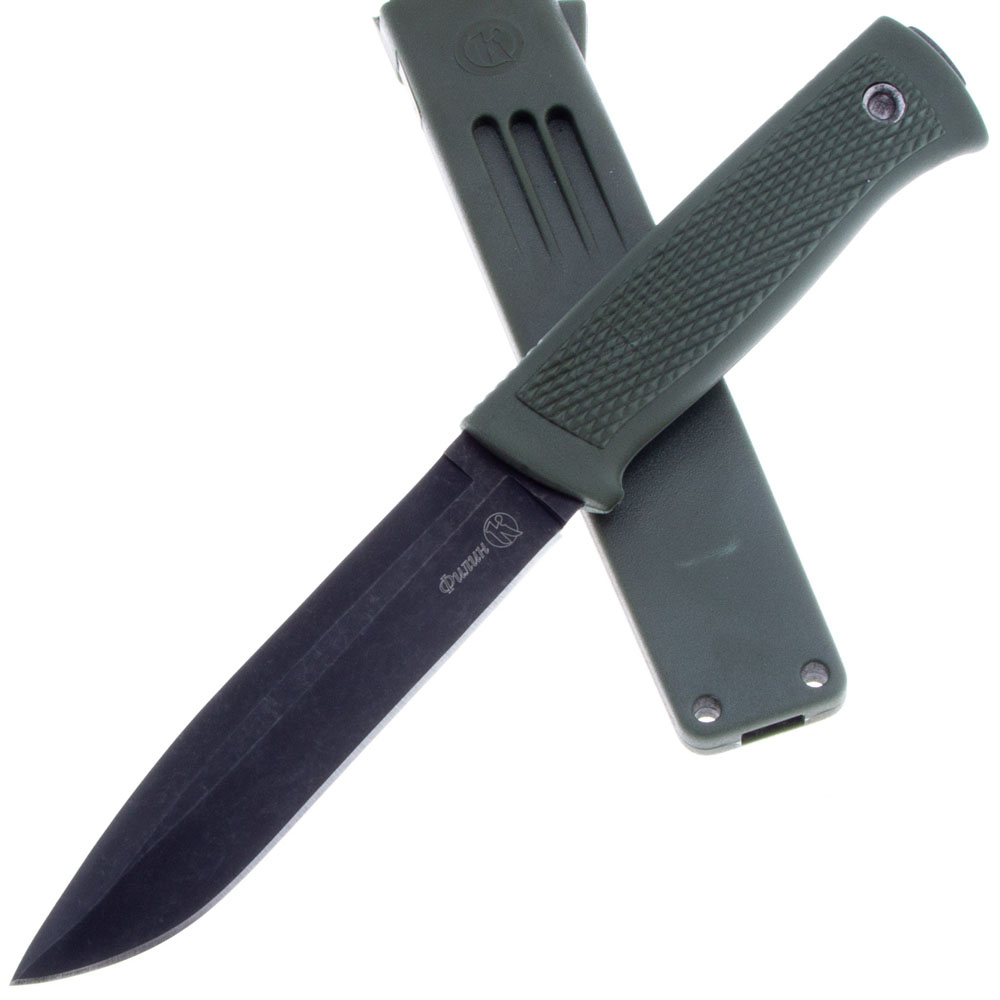 Рукоять ножа имеет эргономичную форму, которая обеспечивает надежный захват, как голой рукой, так и в перчатке. Рукоятка выполнена из эластрона и имеет цепкое рифление. Ближе к тыльной части рукоятка имеет отверстия для подвеса или темляка. Нож поставляется вместе с практичными ножнами из прочного пластика, которые обеспечивают надежную фиксацию клинка, что исключает выпадение ножа или его дребезжание. Ножны имеют петлю из стропы для удобного размещения ножа на поясе или на снаряжении.