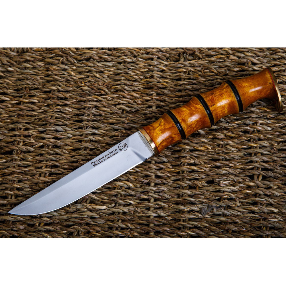 Нож Сампи Бамбук выполнен из кованой стали 95Х18 рукоять карельская береза, вставки черный граб. Больстер и гарда  - латунь, имеется отверстия под темляк. Ножны натуральная кожа.