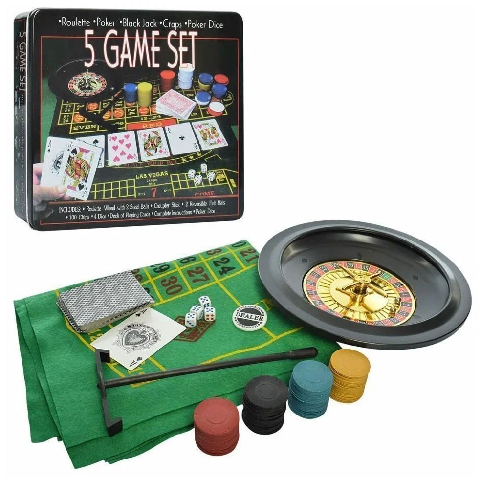 Описание Игровой покерный набор (набор для покера) «Пять в одном» это отличная возможность весело провести время в дружной компании. В этом покерном наборе есть всё, что необходимо для таких игр, как: Покер, Рулетка, Блэк Джэк, Крэпс и просто Кубики. Набор игр 5 в 1 — устрой казино дома! Именно поэтому купить покерный набор (набор казино) - замечательная идея для усмирения своего азарта! Характеристики: Комплектация набора казино (набор для покера): колесо рулетки диаметром 25см, 2 шарика, лопатка для сгребания фишек, два сукна с разметками, 100 фишек по 4 грамма, 4 кубика, колода карт, кнопка дилера. Размер коробки: 32.5х18.5х6 см
